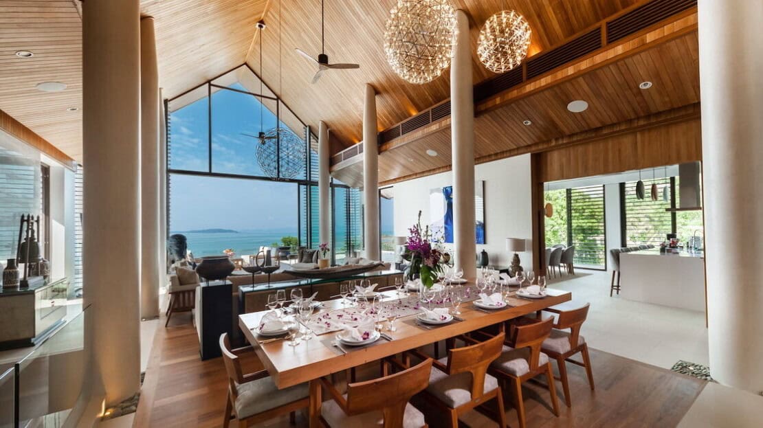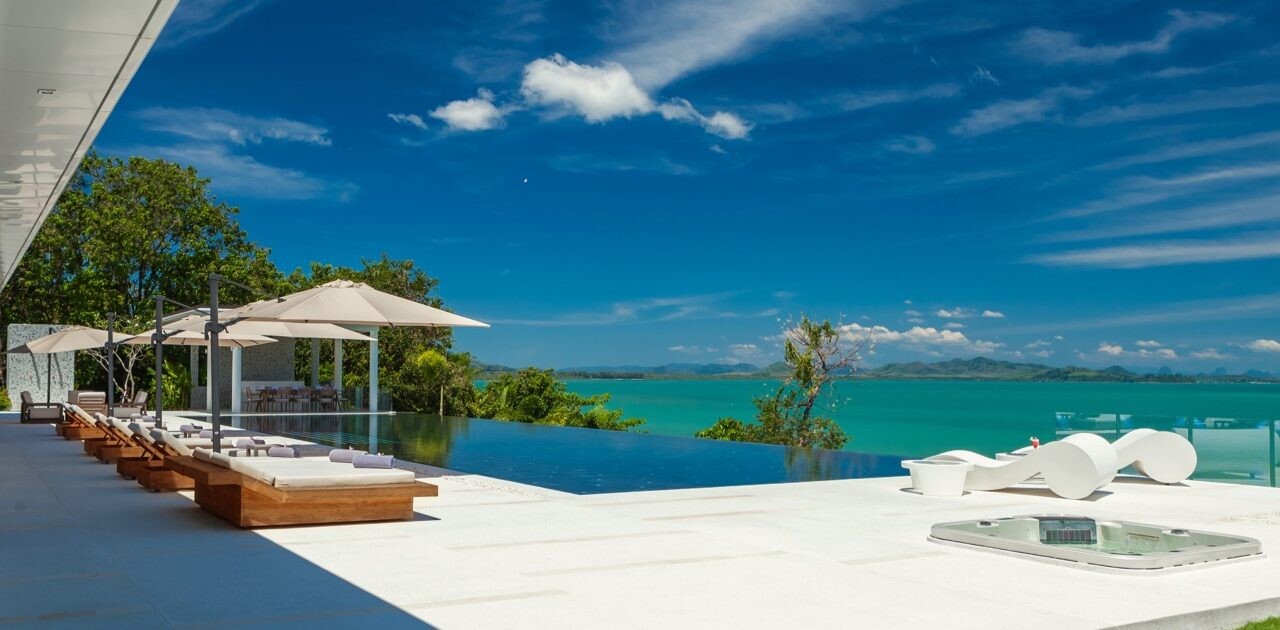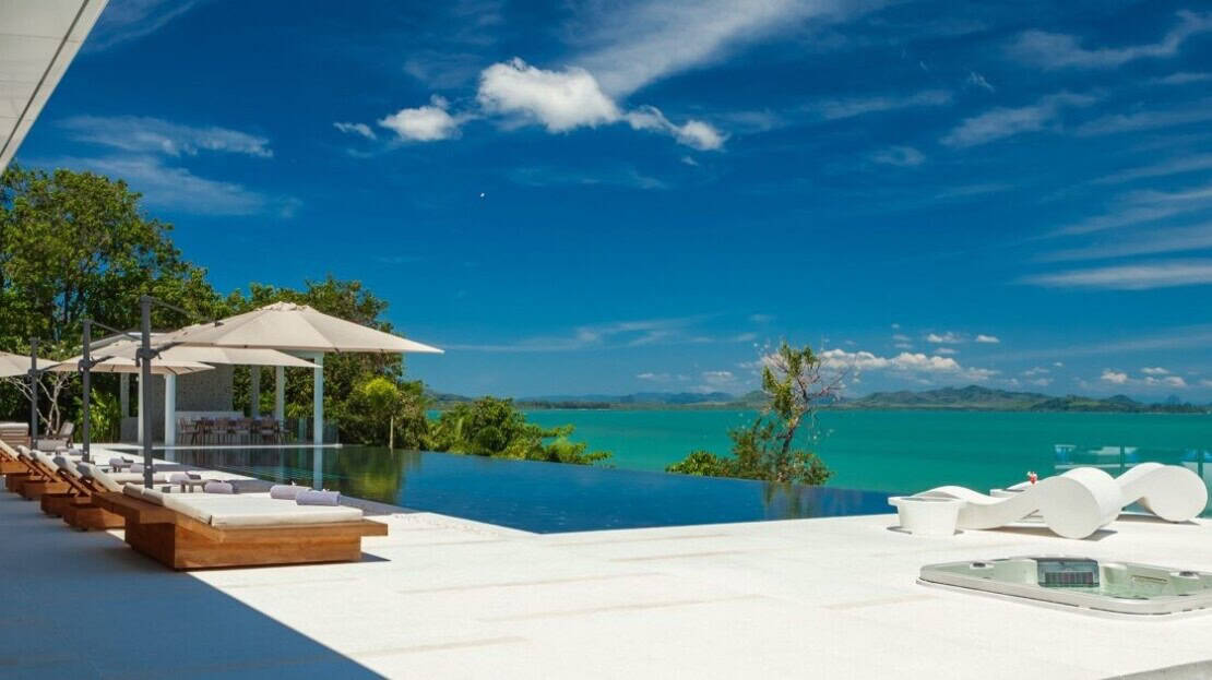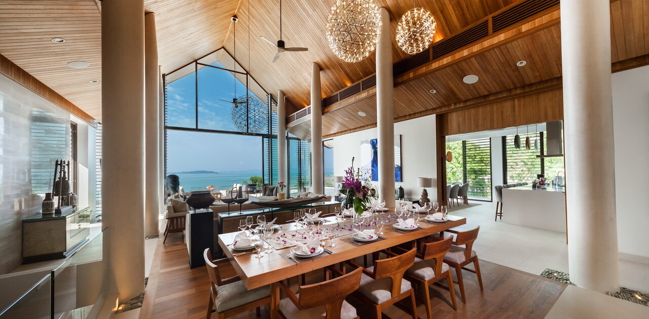 Overlooking the blue waters of the Andaman Sea on Phuket’s eastern shore and the stunning limestone formation of Phang Nga bay, Amarapura is an 7-bedroom villa that is a red carpet A-lister on the luxury villa rental circuit. Situated above the upscale Cape Yamu, the villa perfectly blends stunning avant-garde design features with luxurious retreat-style relaxation.